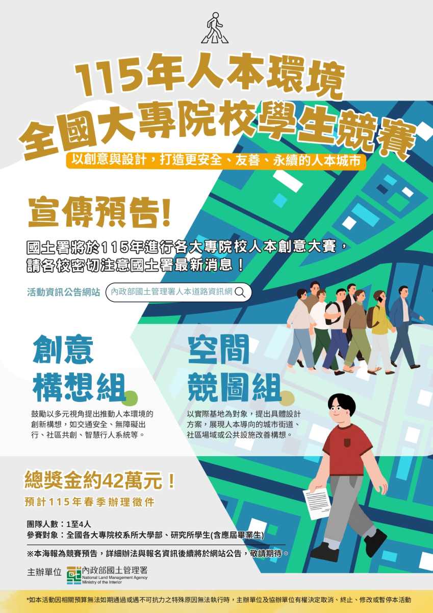 - 內政部國土管理署預定於 115 年春季 辦理「人本環境全國大專院校學生競賽」徵件活動,旨在鼓勵大專青年以創意與空間設計理念回應人本街道與友善社區環境等議題。
