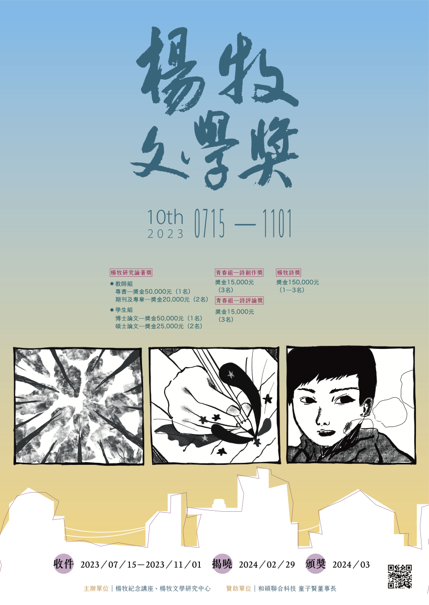 - 「第十屆楊牧文學獎」針對大學、研究所徵文獎項為「楊牧詩獎」及「楊牧研究論著獎」;針對國、高中生徵文獎項為「青春組‧詩創作」、「青春組‧詩評論」,希冀鼓勵國內創作風氣及閱讀楊牧作品,培養文學涵養。