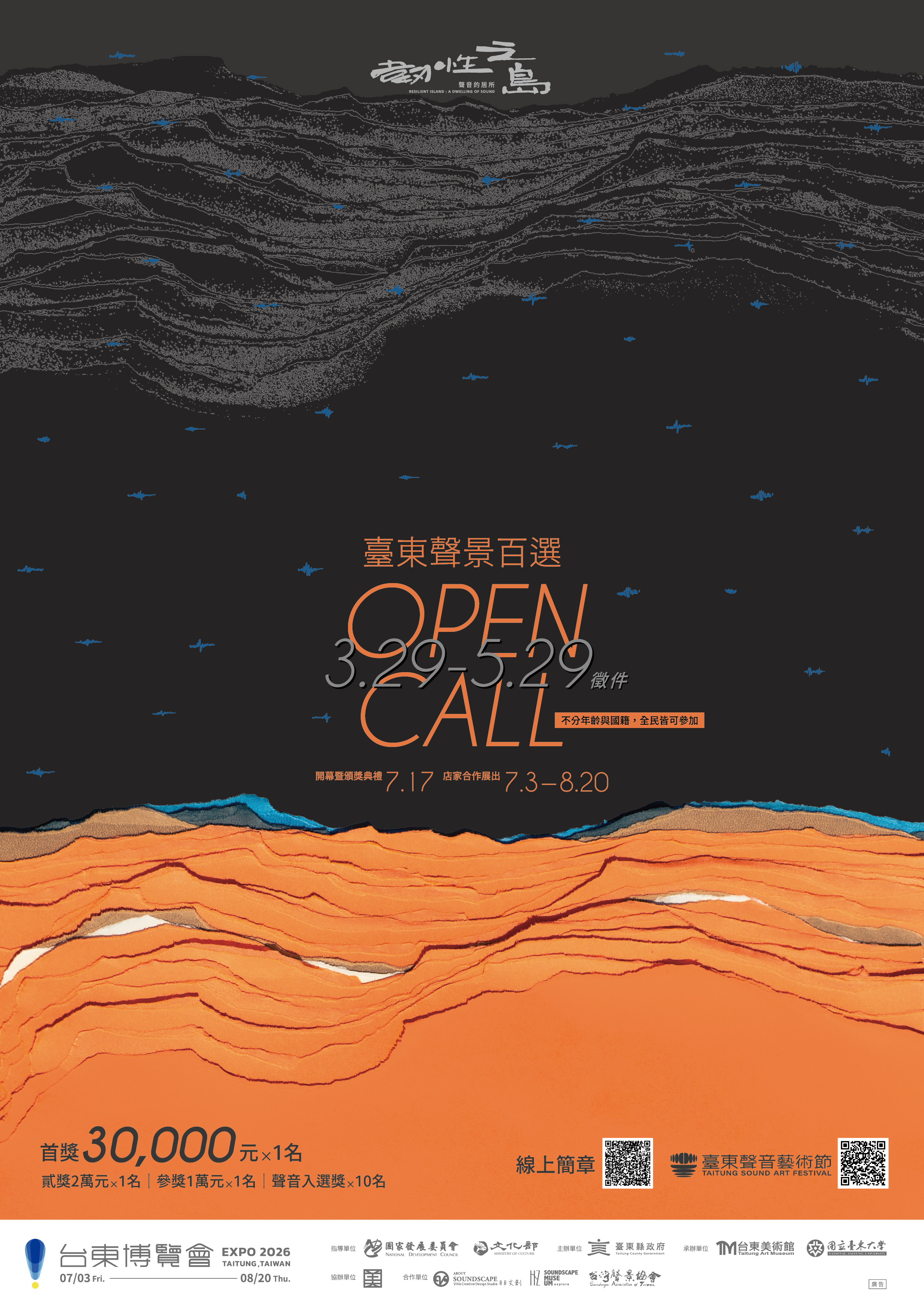 一、為推展與建構臺東聲音無形文化,本中心舉辦 「2026臺東聲音藝術節-臺東聲景百選徵件活動」,邀請各相關領域之專家學者與先進、各科系(所)之教師、研究生踴躍參與音檔投稿,共襄盛舉。